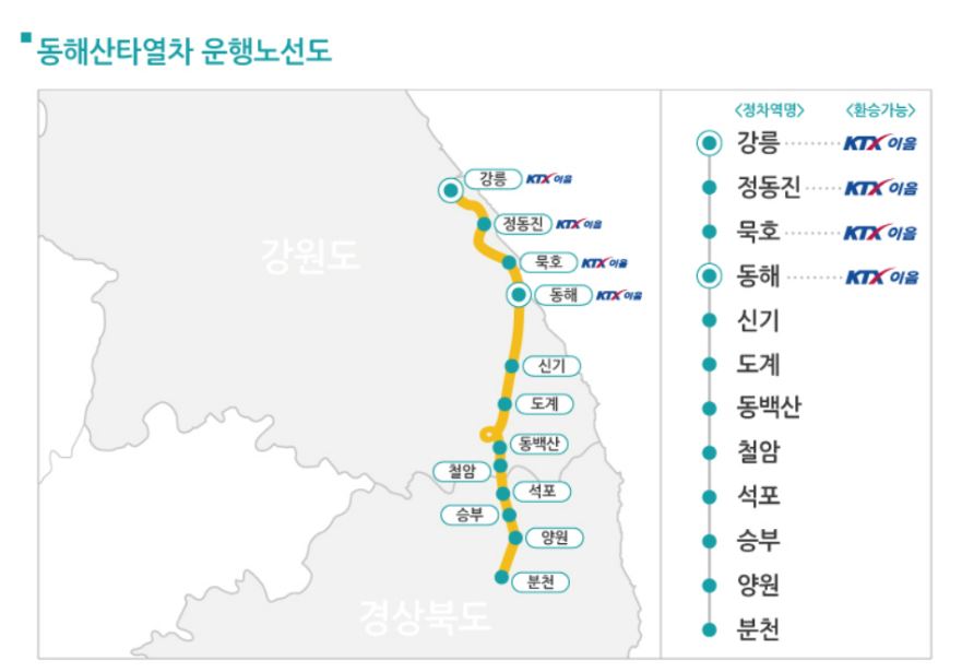 | 강릉~동해 (편도 약 55분) | 여유로운 풍경을 감상할 수 있는 구간 |