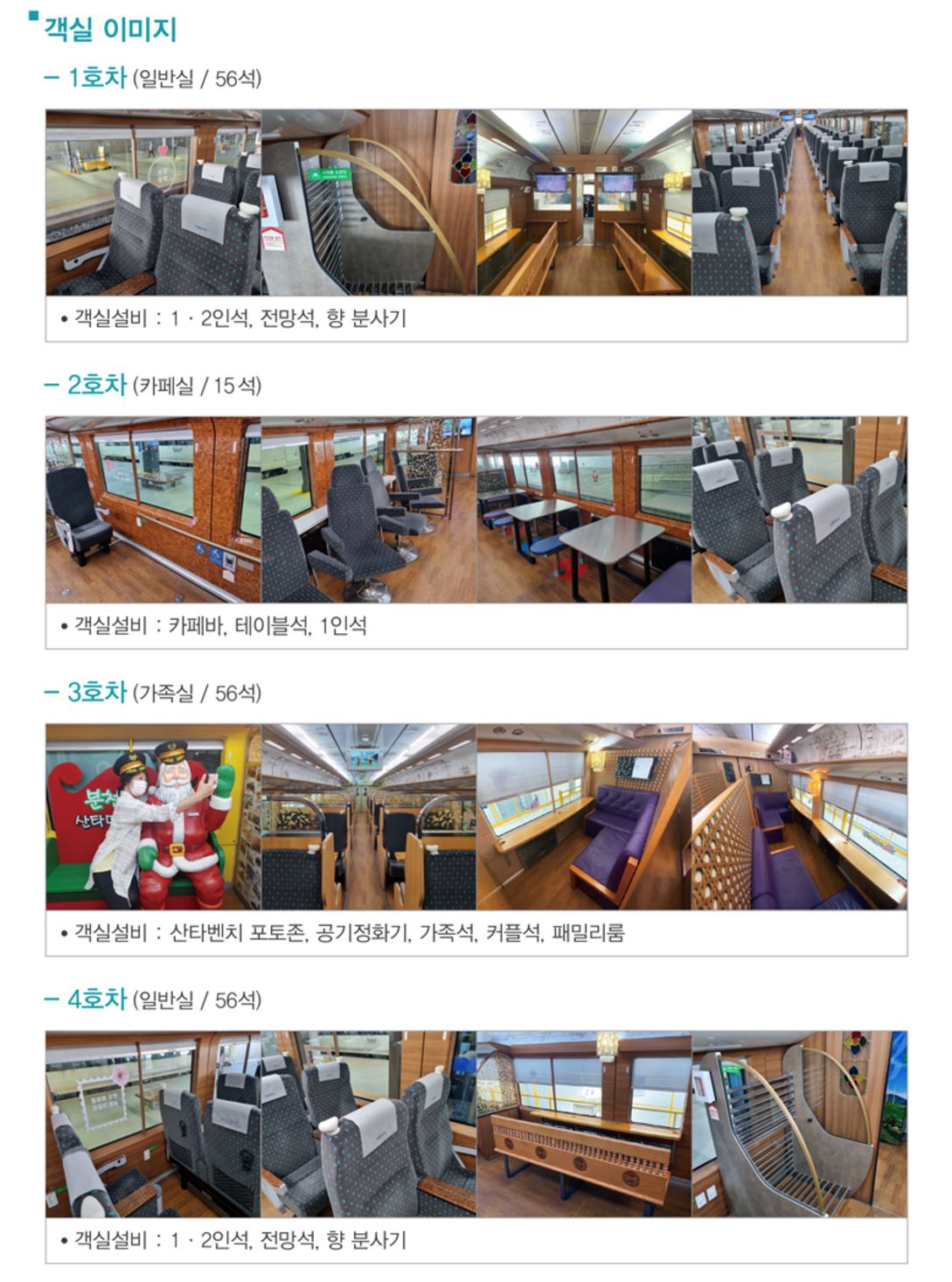 | 1호차 (일반실) | 2호차 (카페실) | 3호차 (가족실) | 4호차(일반실) |