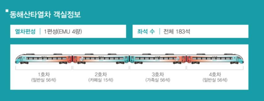 | 1호차 (일반실) | 2호차 (카페실) | 3호차 (가족실) | 4호차(일반실) |