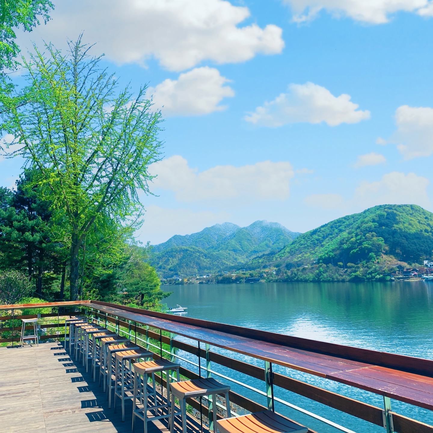 커피 한 잔 들고 야외 정원에 나가 북한강을 배경으로 인생샷 찍으면