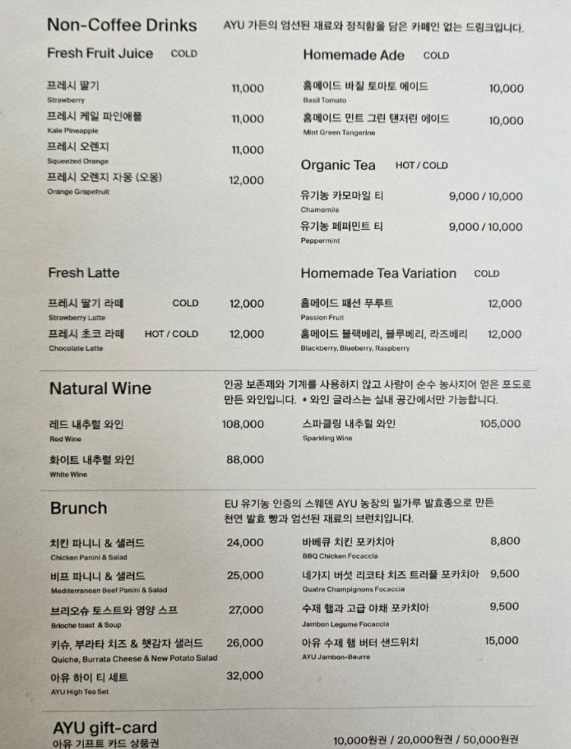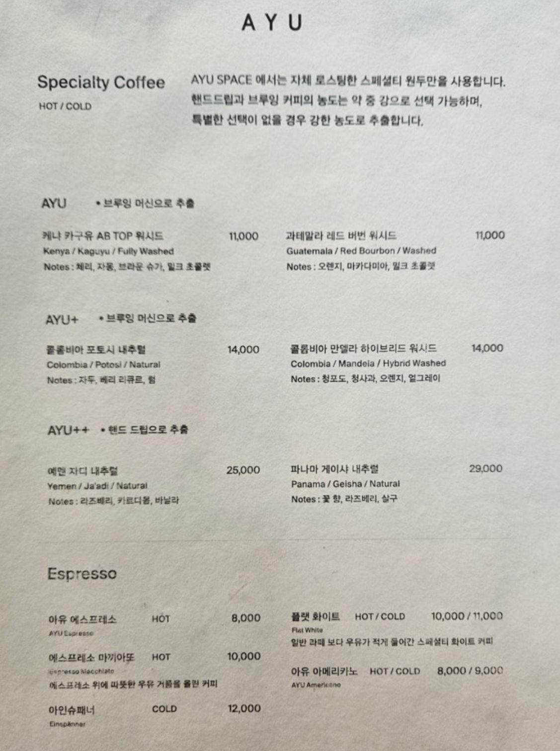 아유스페이스 메뉴 & 가격