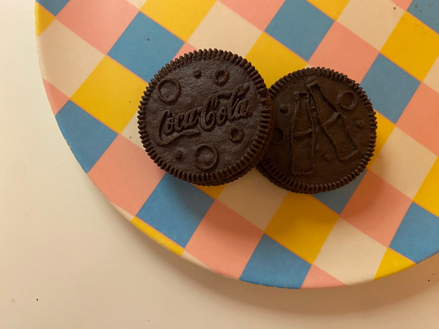오레오 샌드위치 쿠키 외관 한쪽은 오레오 로고 다른 쪽은 코카콜라 로고가 새겨져 있습니다.