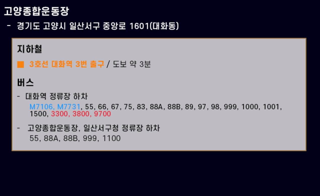 | 장소 | 기도 고양시 고양종합운동장 (지하철 3호선 대화역 3번 출구 도보 3분 거리) |