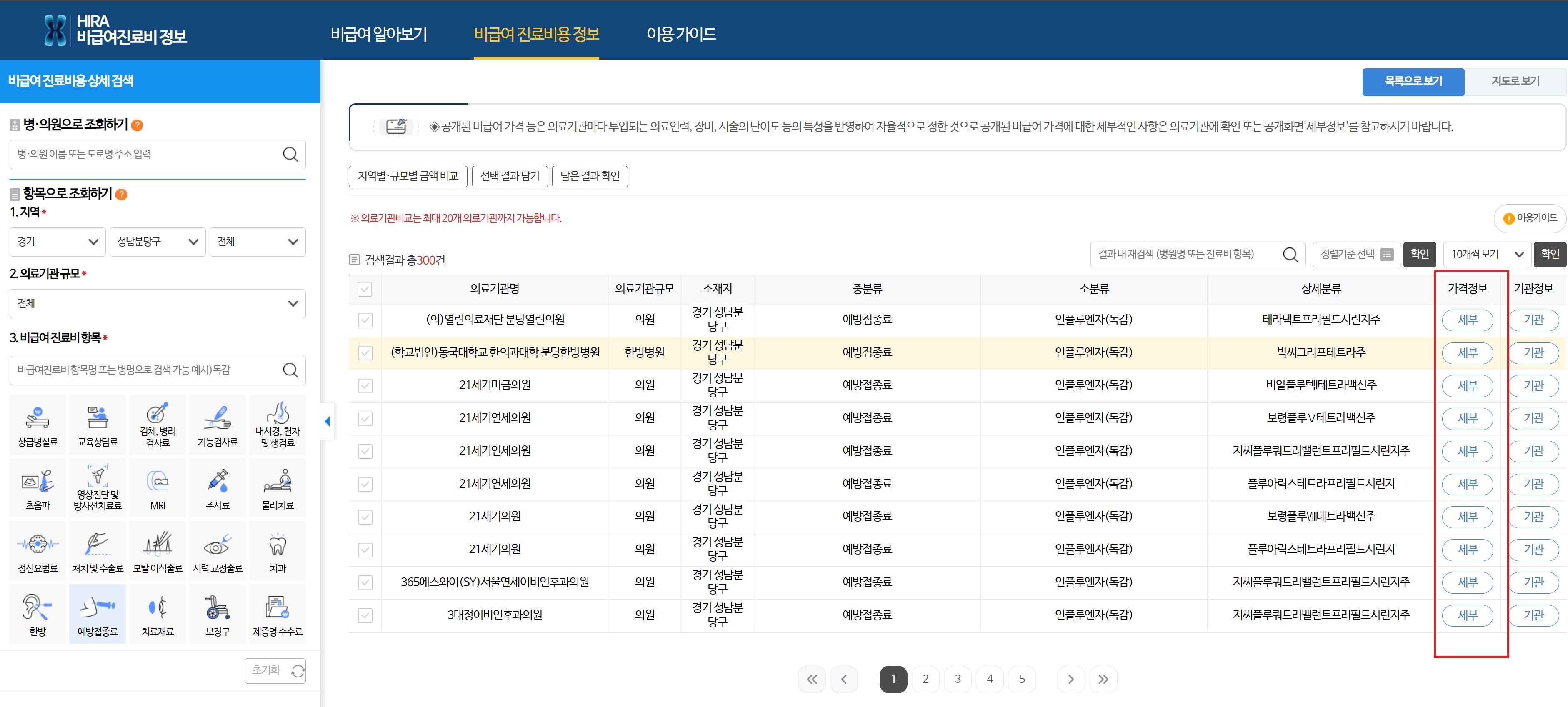 상단 비급여진료비용정보에서 병원별 가격을 비교할 수 있는데요.